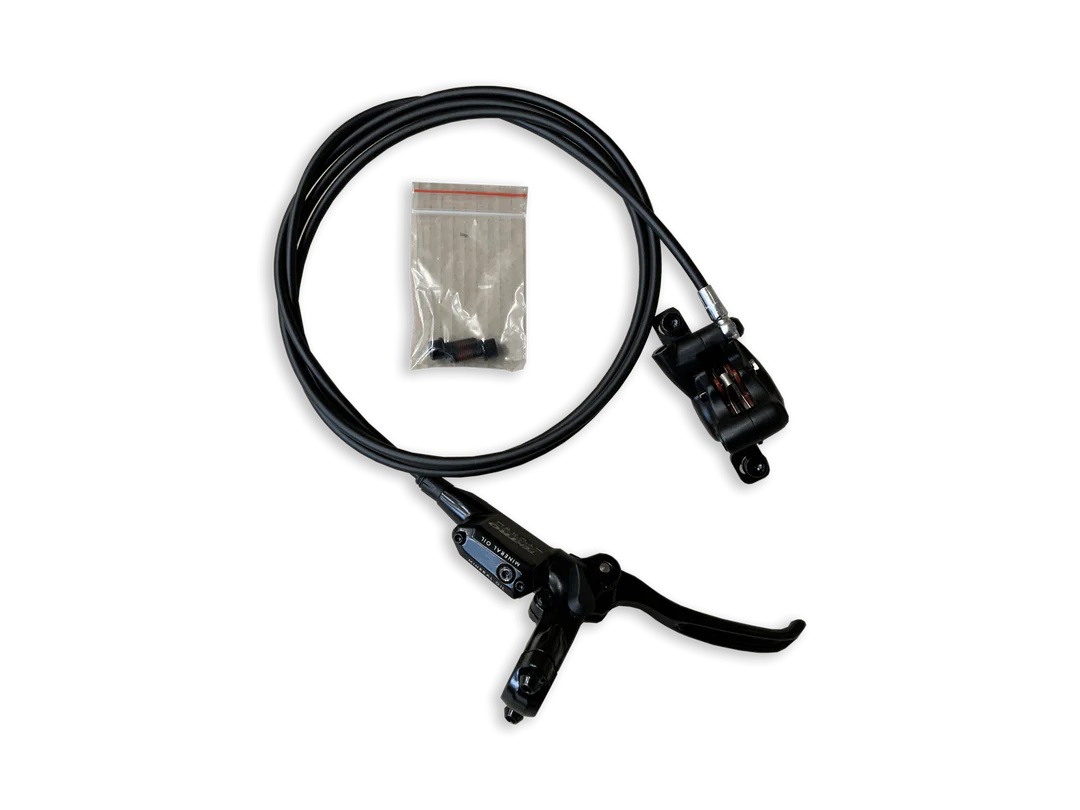 Set bestaat uit een remhendel met parkeerrem, remleiding en remklauw voor de achterrem. Gebruiksklaar en reeds gevuld en ontlucht en compleet met remblokken.