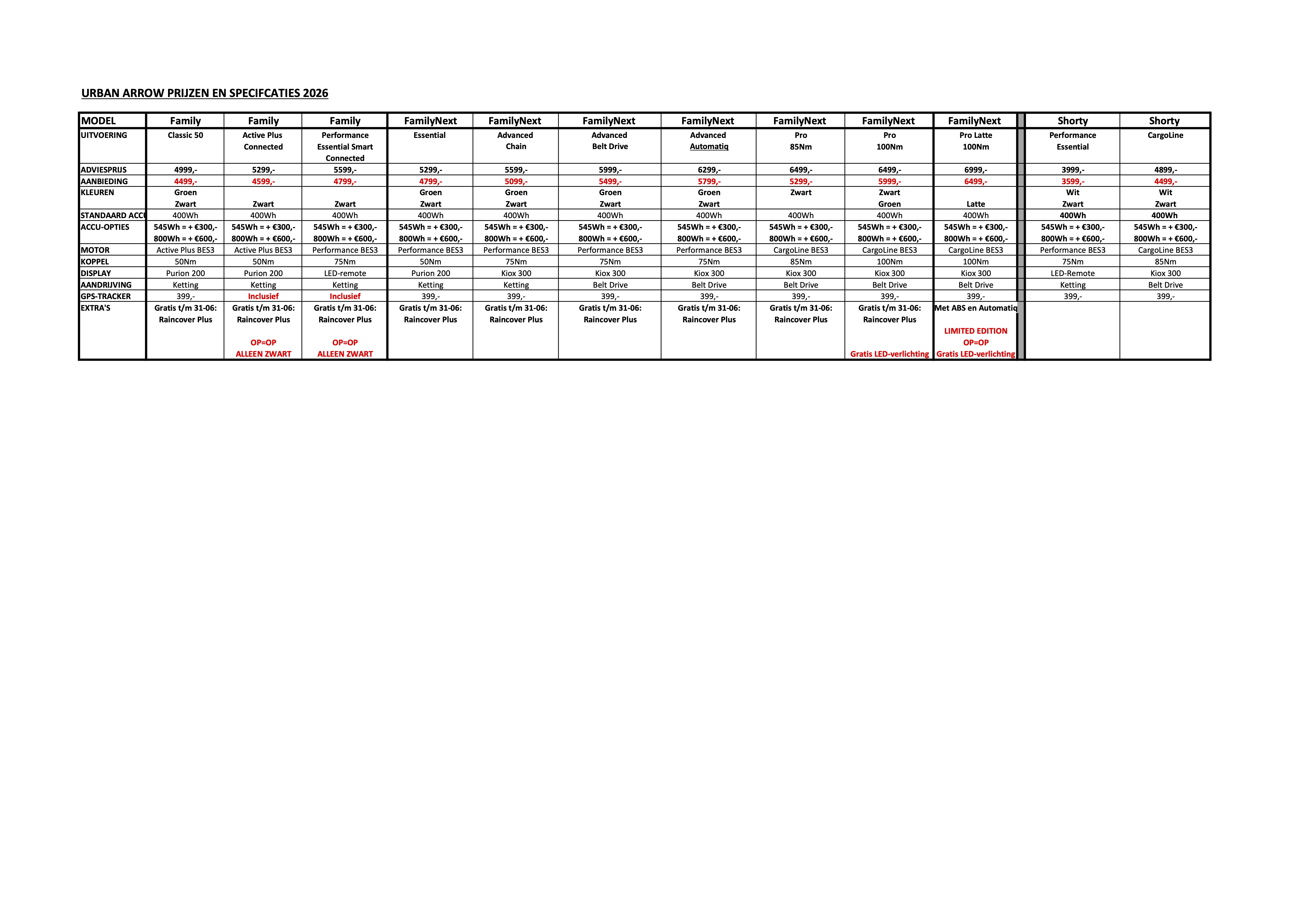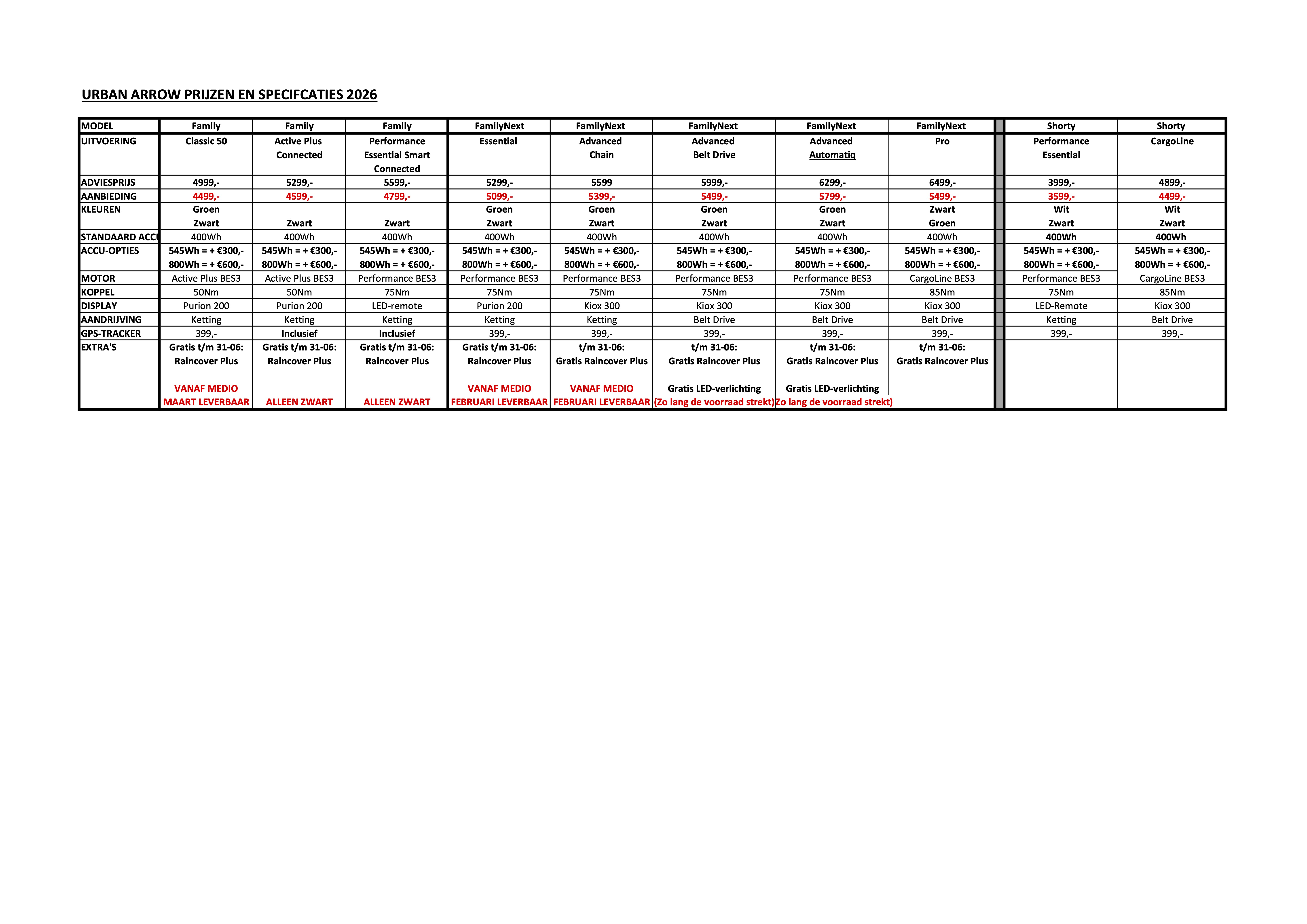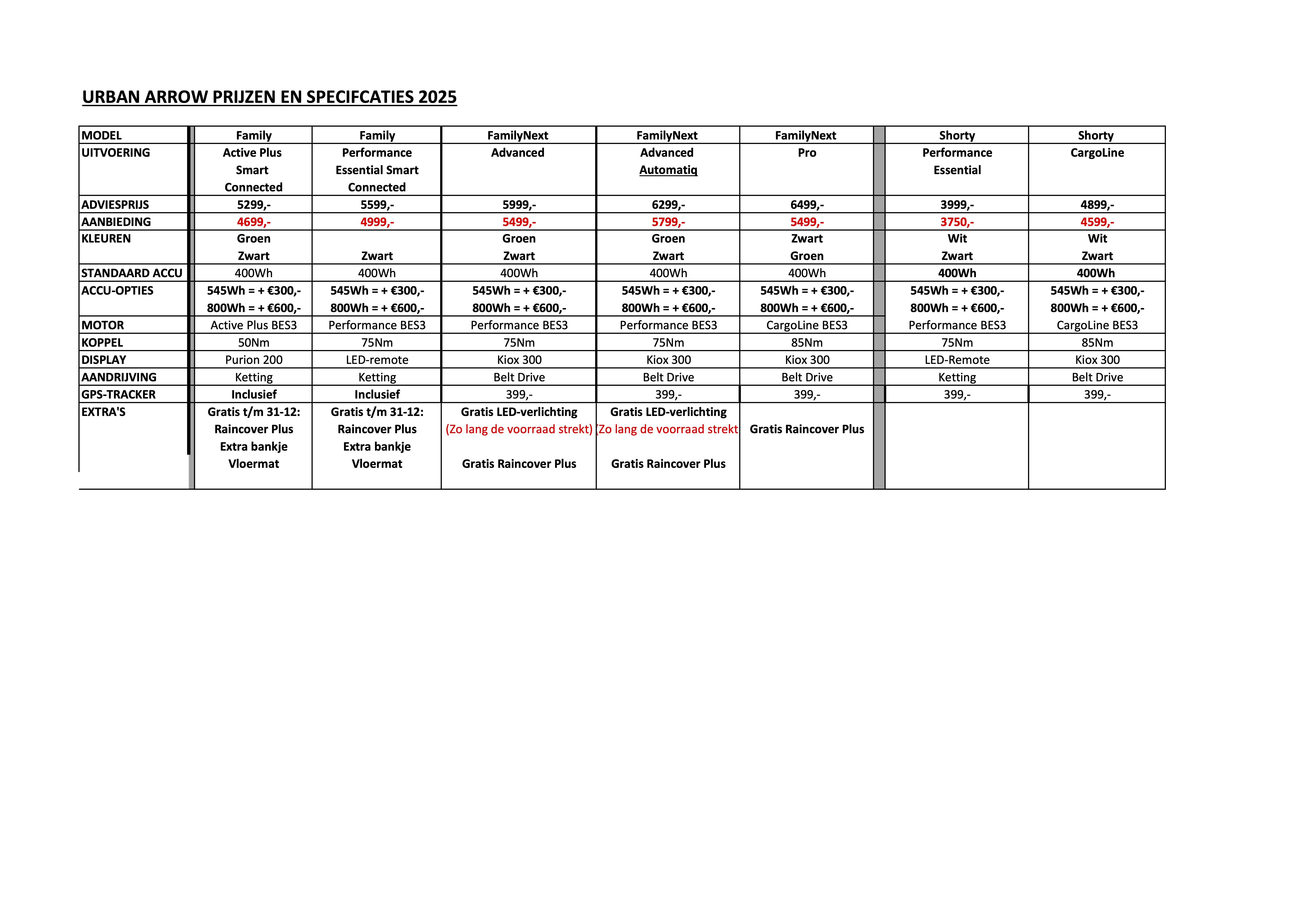 Die vragen krijgen we dagelijks en dus hebben we hieronder een overzicht staan van de modellen, hun eigenschappen en kenmerken en uiteraard de verschillende prijzen. Van enkele modellen verschillen de prijzen per kleur en accu's. Met dit overzicht kunt u de verschillen eenvoudig zien en beoordelen welk model het beste bij u past. Uiteraard kunt u bij twijfel ook altijd uw vraag nog stellen aan onze Urban Arrow-expert via whatsapp (06-19 21 25 20) of mail: hans@rijwielwebshop.nl